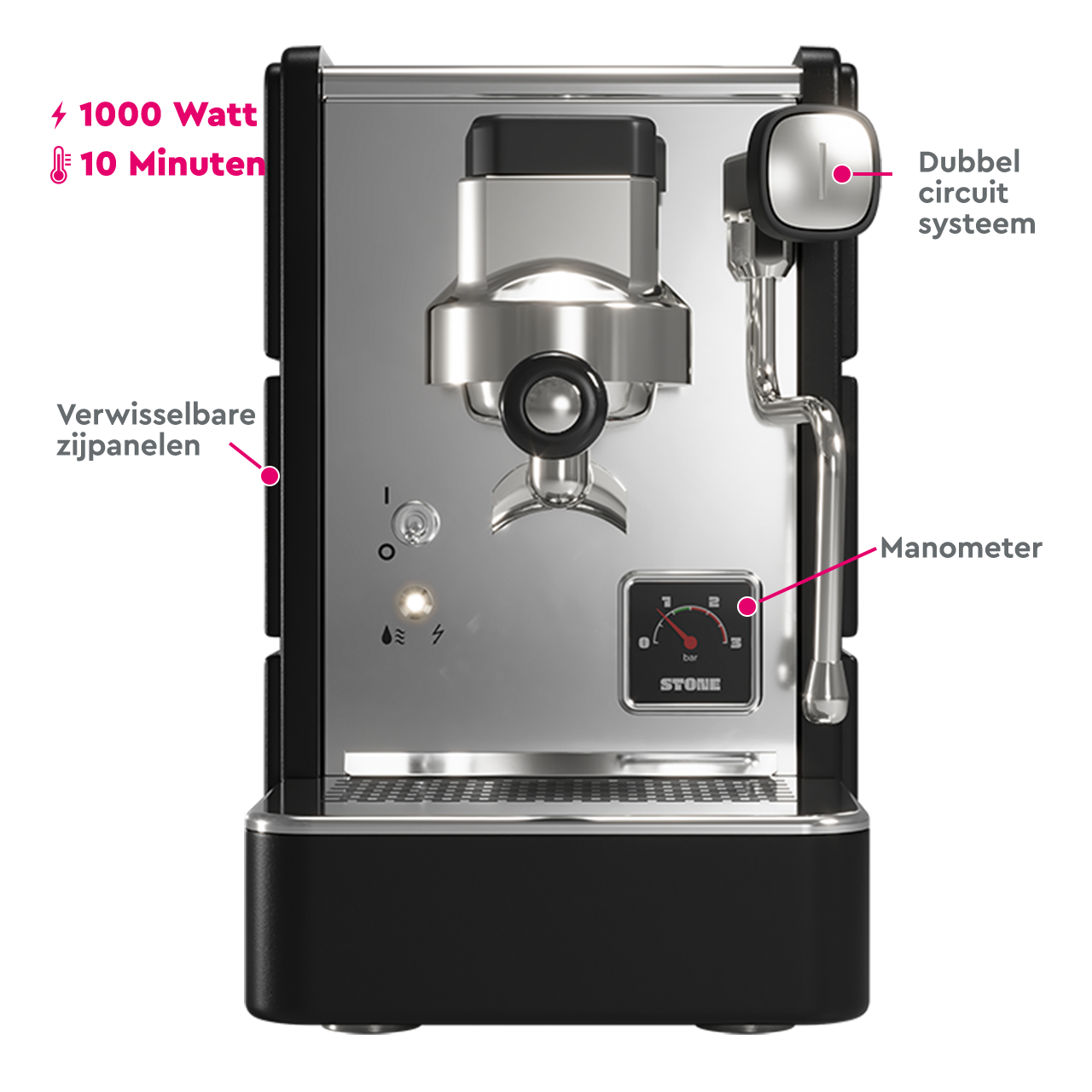 Met een snelle opwarmtijd van slechts 10 minuten bent u zonder lange wachttijd klaar voor de perfecte koffie-ervaring. En dankzij het innovatieve Quick-Coupling-systeem is het bijzonder eenvoudig en snel om de zijpanelen te verwisselen. Of u nu verhuist of uw inrichting verandert, de Stone Espresso machine kan zich in een handomdraai aanpassen aan zijn omgeving. In combinatie met het beste BWT Magnesium Mineralized Water staat niets een perfecte koffie-ervaring thuis in de weg.