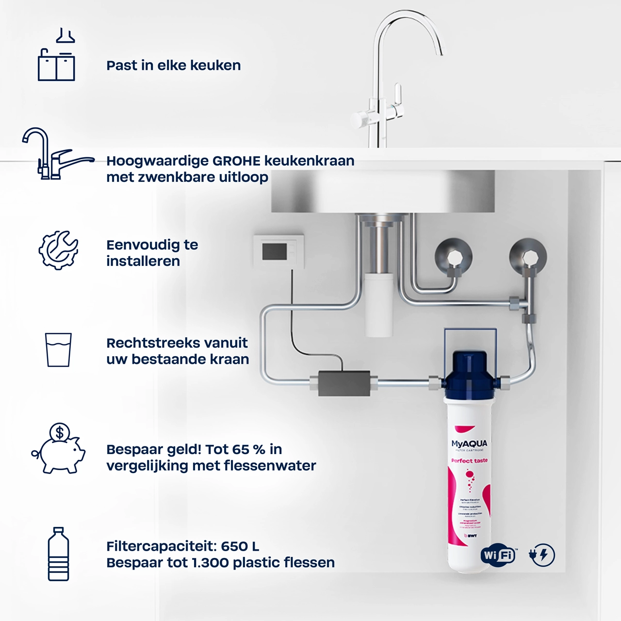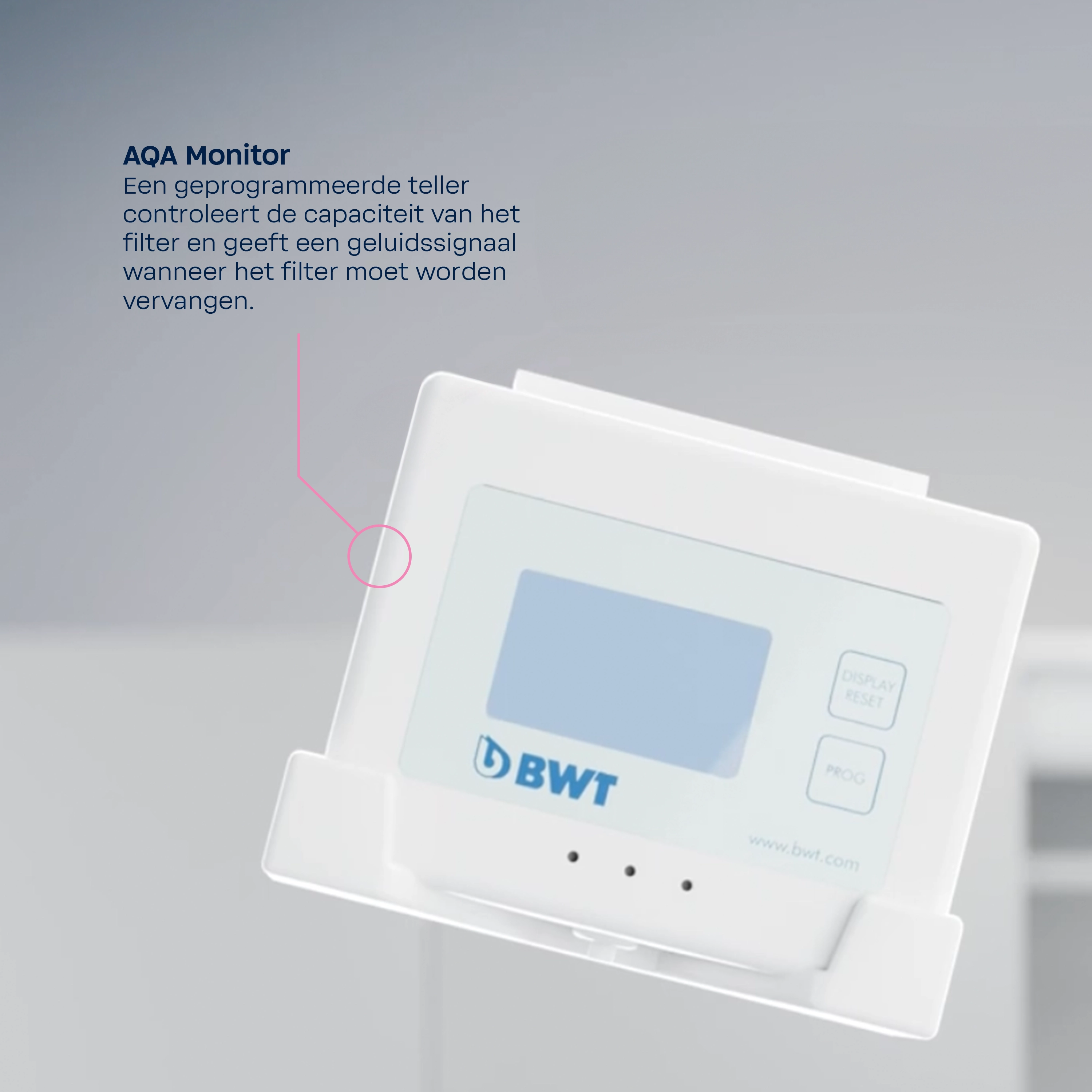 Het complete AQA drink-filterprogramma kan worden gebruikt met de nieuwe BWT-filterkraan, aangedreven door Grohe. Verbeter jouw drinkwater door magnesium en zink toe te voegen! In vijf filtratiestappen worden onaangename geuren en smaken zoals chloor, evenals zware metalen zoals koper, lood en nikkel verminderd. Bovendien verwijdert het filter effectief kalkaanslag, waardoor jouw huishoudelijke apparaten worden beschermd.