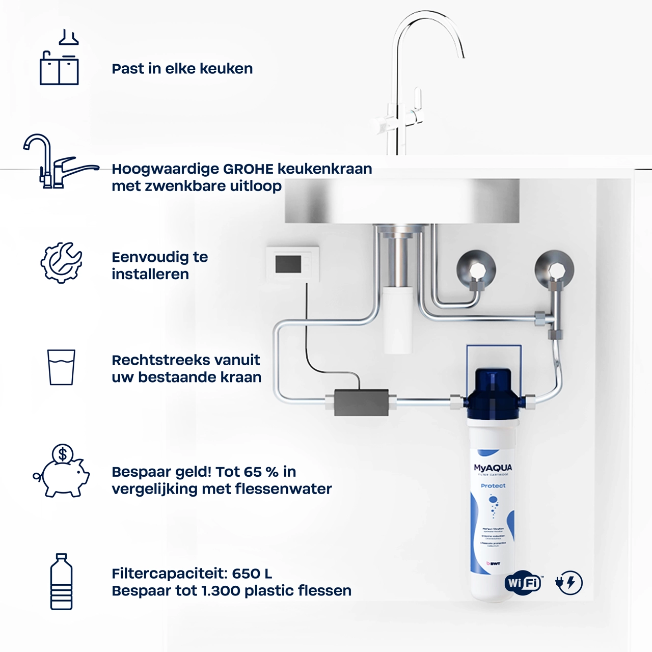 Het complete AQA drink-filterprogramma kan worden gebruikt met de nieuwe BWT-filterkraan, aangedreven door Grohe. Verbeter jouw drinkwater door magnesium en zink toe te voegen! In vijf filtratiestappen worden onaangename geuren en smaken zoals chloor, evenals zware metalen zoals koper, lood en nikkel verminderd. Bovendien verwijdert het filter effectief kalkaanslag, waardoor jouw huishoudelijke apparaten worden beschermd.