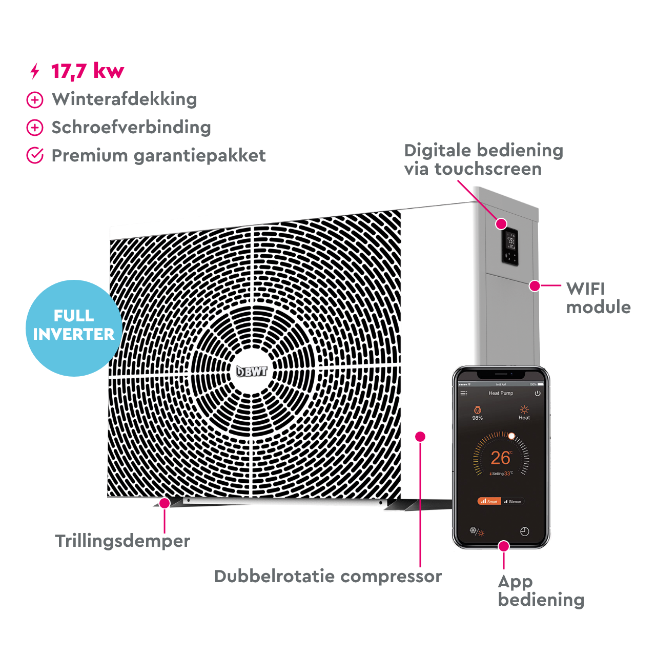 Met de WIFI-module kan de BWT Inverter Horizontal op elk moment en met slechts enkele muisklikken op de smartphone worden bewaakt. Niet alleen worden de actuele gegevens in real time weergegeven, de warmtepomp kan ook op elk moment en vanaf elke locatie worden bediend. Opgelet: De WIFI-module kan alleen worden gebruikt als de warmtepomp is geïnstalleerd op een locatie met WIFI.