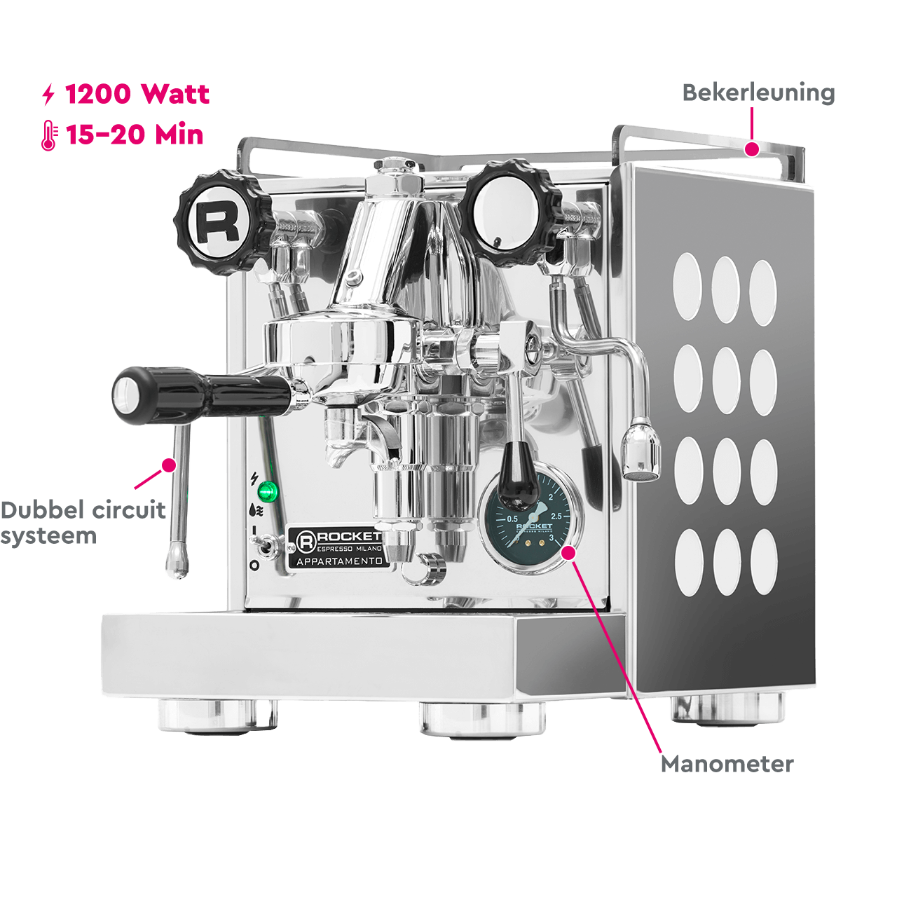 - OPWARMTIJD: De espressomachine is in 15-20 minuten op bedrijfstemperatuur