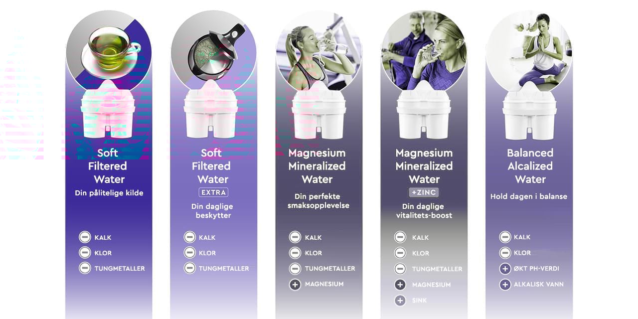 Uansett om du er tindebestiger eller tredemølledronning, kaffeavhengig eller te-elsker, arbeidsjern eller avslappet. Uansett hva slags type du er. BWT har det rette vannet for dine behov. Med BWT-bordvannsfilter får springvannet en oppgradering. Uansett om du velger Soft Filtered Water, Soft Filtered Water EXTRA, Magnesium Mineralized Water, Magnesium Mineralized Water + ZINC eller Balanced Alkalized Water: Alle filterpatroner passer i alle bordvannsfiltre.