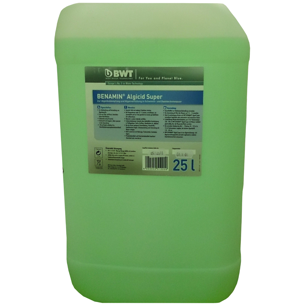 Benamin ALGICID SUPER jest płynnym preparatem do zwalczania glonów i bakterii. Zawiera związki amonowe (czwartorzędowe) oraz substancje zapachowe, nie zawiera chloru. Własności: niebieska ciecz. Benamin ALGICID SUPER jest silnie działającym środkiem niszczącym glony. Preparat ten nie może jednak całkowicie zastępować chloru jako środka dezynfekującego wodę basenową. Dlatego oprócz Benamin ALGICID SUPER należy raz w tygodniu przeprowadzać chlorowanie dawką uderzeniową (przy użyciu tabletek lub granulatu: Benamin QUICK TABLETTEN lub GRANULAT).